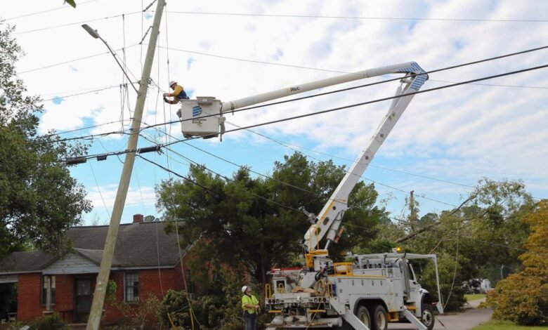 A lineworker repairs a power line in the aftermath of Hurricane Helene in South Carolina