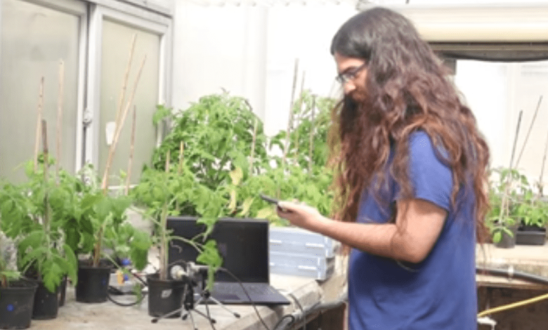 Illustration, from above: Recording plants (still image from Tel Aviv University’s short film “Global Breakthrough: Plants Emit Sounds!); Diagram from “Sounds emitted by plants under stress are airborne and informative,” Cell, Volume 186, Issue 7; and Barbara McClintock at work (Barbara McClintock Papers, American Philosophical Society).