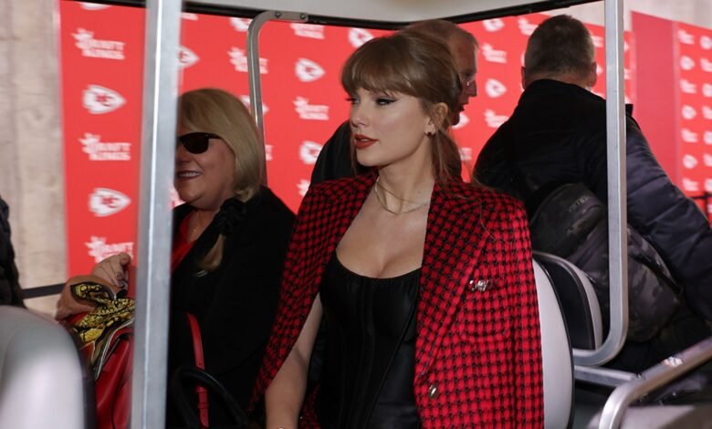 Taylor Swift Standing on Business, Blazer and Miniskirt at Chiefs Game