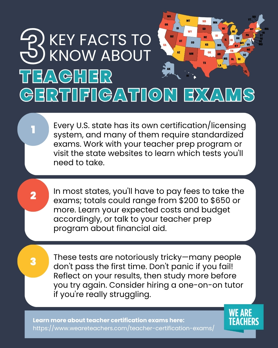 Important note: Some states offer tests for free, reimburse teachers once they pass, or offer vouchers to help reduce costs. Check with your state for complete details. If you’re having trouble affording the testing fees, talk to your teacher prep program advisor about potential financial aid options.