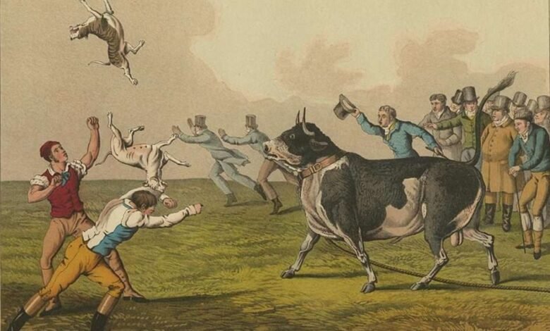 Illustrations, from above: “Bull Baiting” by J. Clark, 1820 (London); Bear-baiting in the 14th century (British Library); badger-baiting in London, ca. 1823; “Terrier Dog Major ratting,” by an unknown 19th century artist (Major was known to have killed 100 rats in 8 minutes, 58 seconds); “A Gander-Pull” illustration of a live goose pulling in 19th-century West Virginia by Frederic Remington; and a bear and bull fight in New Orleans in 1853.