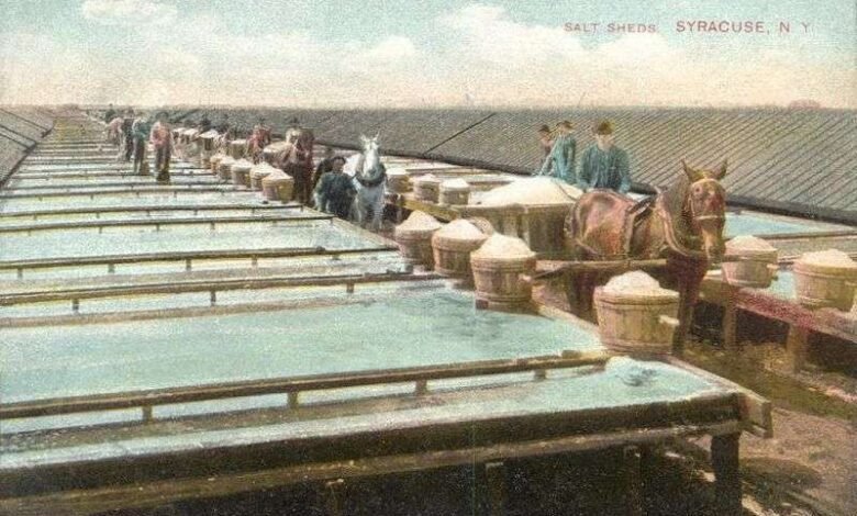 Postcard showing evaporators and salt sheds using solar evaporation method around 1908 in Syracuse, NY.Postcard showing evaporators and salt sheds using solar evaporation method around 1908 in Syracuse, NY.Before the creation of shaft salt mines, the production of salt in New York State required the evaporation of salt brine extracted from salt springs and wells – first by applying heat and later with large solar evaporators.