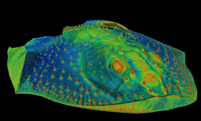 CT scan of the front of a skate, showing the hard, tooth-like denticles (orange) on its skin