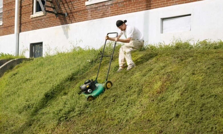 Man mowing downhill Description Man wearing white overalls and back to front baseball cap trying to mow down steep verge outside building. Memphis, USA