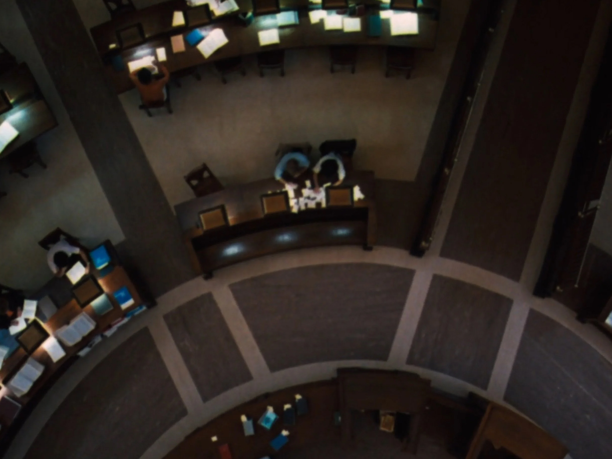 Liminal spaces – transitional spaces which feel eerie and unsettling without human presence – feature frequently. Dimly-lit empty corridors, deserted rain-slicked roads, and a dark elevator where moody chiaroscuro throws strong shadows on Redford and Hoffman’s pensive faces all evoke the atmosphere of danger and fear surrounding Woodward and Bernstein’s pursuit of the truth. Then there’s the famous overhead shot in the Library of Congress, where the camera slowly pans to 100 feet above Woodward and Bernstein as they thumb through reams of library records – the space isn’t completely empty, but it’s unsettling all the same, a striking reminder of the scale of the institution that the two small figures, literally dwarfed here by their imposing surroundings, are trying to bring down. This intelligent visual storytelling is the work of legendary cinematographer, Gordon Willis, who, fresh from painting Michael Corleone’s moral descent with evocative shadows in The Godfather Part II just two years prior, similarly conjures up the intrigue and tension befitting of a crime story – though this time it’s all true.