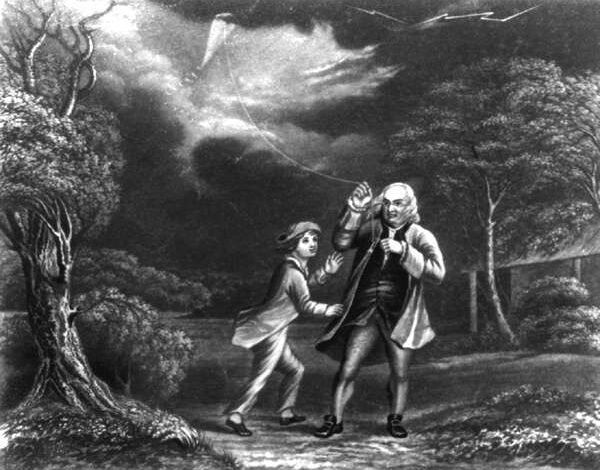 Illustration: Henry S. Sadd shows Benjamin Franklin experimenting with lightning (Library of Congress).