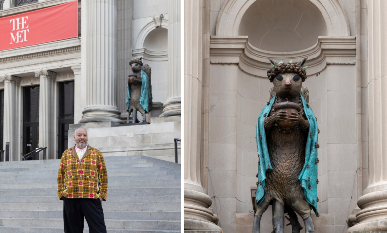 Portrait of Jeffrey Gibson by Eileen Travell; Jeffrey Gibson (American, born 1972). Installation view of “they plan and prepare for the future fvni / sa lo li/squirrel” for The Genesis Facade Commission: Jeffrey Gibson, “The Animal Therefore I Am,” 2025. Courtesy the artist, Silicon bronze with patina finish. Image credit: The Metropolitan Museum of Art, Photo by Eugenia Burnett Tinsley