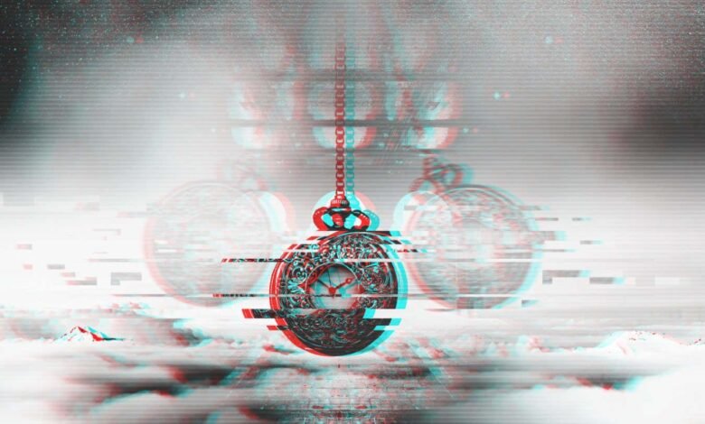 Time glitch concept. Hypnotising watch on a chain swinging above clouds.; Shutterstock ID 1121133503; purchase_order: -; job: -; client: -; other: -