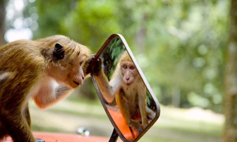 What does this monkey make of the image in the car mirror?