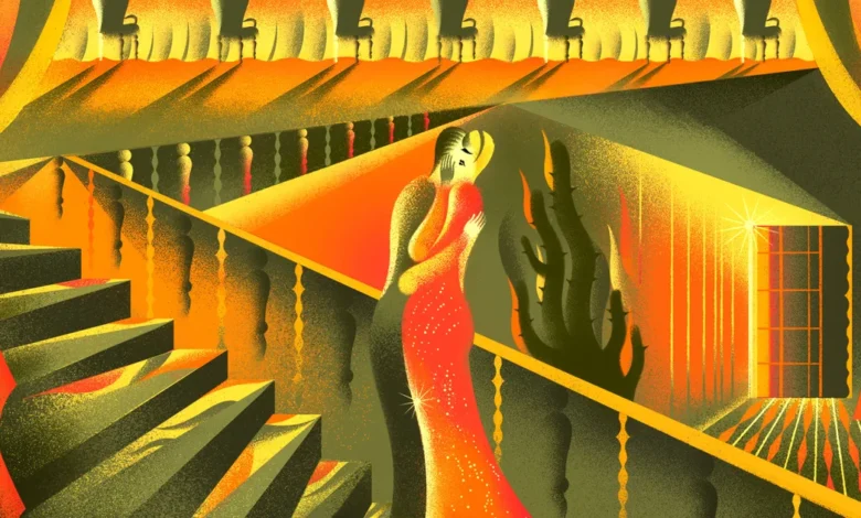 Emma visits San Remo, full of unformed hopes, and ends up shoplifting a book called Atelier Simultane about another Russian émigré to France, the artist Sonia Delauney. This book, with its colour-splashed cover, is a talisman for all that she is about to experience. Cannarozzi’s costumes veer into a new palette, as oranges and reds clothe Emma’s lower half. Undressing is established as a motif.
