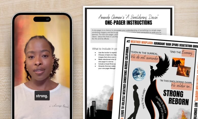Before you dig into the texts for the project, introduce the idea of the one-pager. If you’ve never done a one-pager before, take a few minutes to explain the concept and show some examples to your class. Let students know they’ll be interpreting Amanda Gorman’s poem in the context of the climate situation in California, which you’ll be reading about shortly.