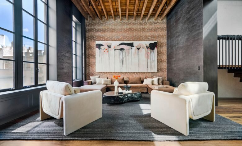 Via the foyer stairs, the home’s stunning second floor is its most dramatic space. Beneath a massive skylight, the living room is framed by 26-foot-high ceilings, 25 feet of windows, exposed beams, brick walls, and a wood-burning fireplace.