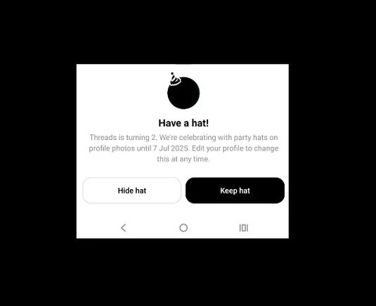 Yes, a party hat, that you can’t place on your profile image, and just sits as an overlay, no matter where your head is placed in the frame, if indeed it is your head that you’re showing in your Threads profile.