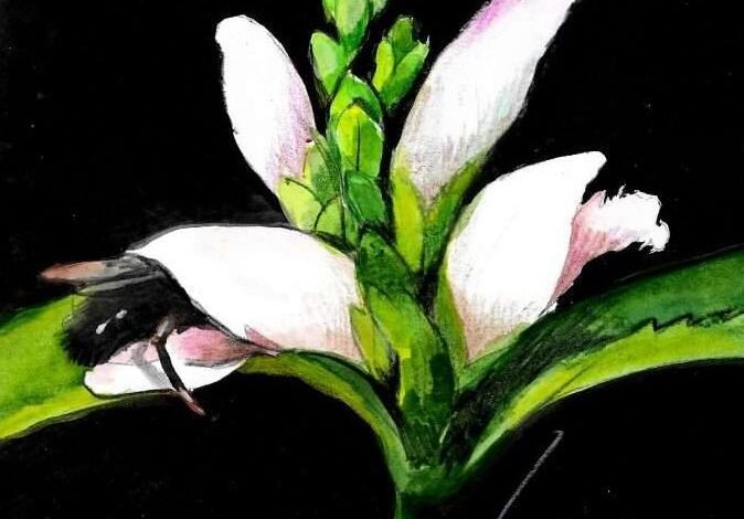 The oblong flowers, white and lavender-tinged and roughly the size of a thumb, grow in clusters atop stems that can measure up to four feet tall.