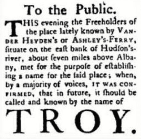 Illustration: A newspaper announcement run in Albany and Lansingburgh newspaper’s announcing the renaming of Troy, January 1789.