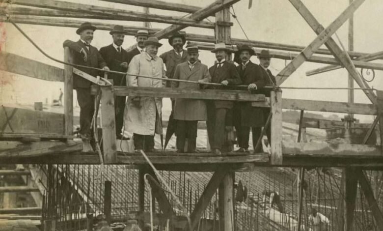 Illustrations, from above: Francois Hennebique, center, in white, at a job site in France, 1915; the 15-story Ingalls Building in Cincinnati, Ohio the world’s first reinforced concrete skyscraper was built in 1903 (2006 photo); “Reinforced Concrete in Factory Construction,” The Atlas Portland Cement Company, New York, 1907 (The Skyscraper Museum); Gair Factory No. 7 in Brooklyn, built by William Higginson and Turner Construction, 1914 (from the cover of Cement Era, 1915); and the interior of reinforced concrete Victory Mills factory.