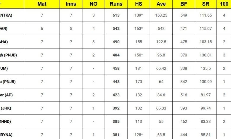 Rounding out the top 10 are Ravikumar Samarth from Uttarakhand with 385 runs and Ankit Kumar from Haryana with 381. As the tournament progresses into the preliminaries, the competition to secure a place among the top ten run-scorers intensifies.