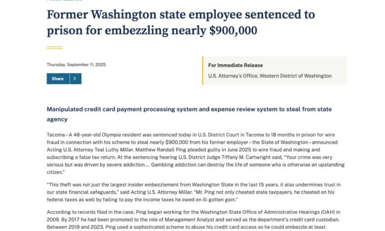 The United States Attorney’s Office for the Western District of Washington prosecuted Matthew Randall Ping, 48, on charges that he stole $878,115 while working as a management analyst within the Washington State Office of Administrative Hearings (OAH). In his position, Ping served as the department’s credit card custodian.