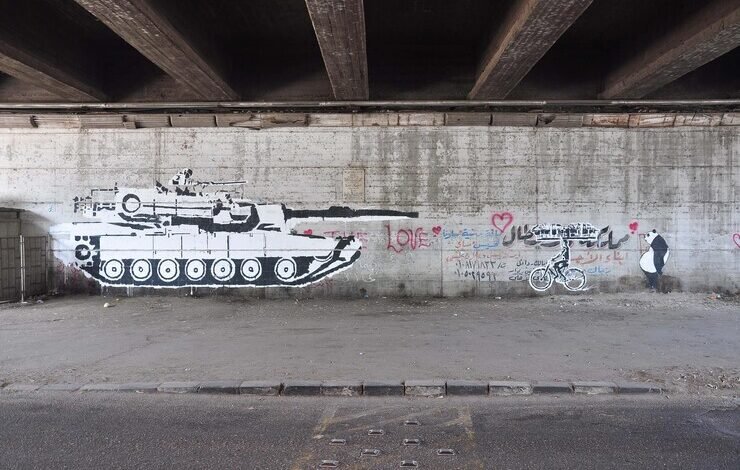 A wall painted with the image of a tank pointing its gun at a person on a bike.