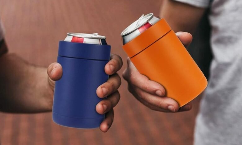 two men holding drinks in insulated holders