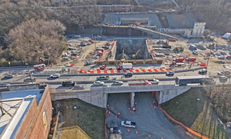 In December 2025, the Tonnelle Ave bridge structure was completed, opening the passage beneath the highway that will be used to bring the TBM components in for assembly. Credit: Gateway Development Commission