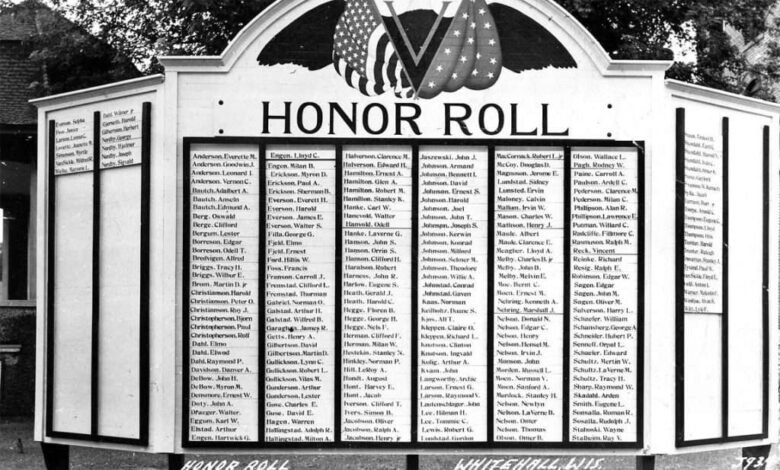 Illustrations, from above: Whitehall, Wisconsin’s WWII honor roll; and a World War Gold Star Banner showing three men in the service, including one who lost their life.
