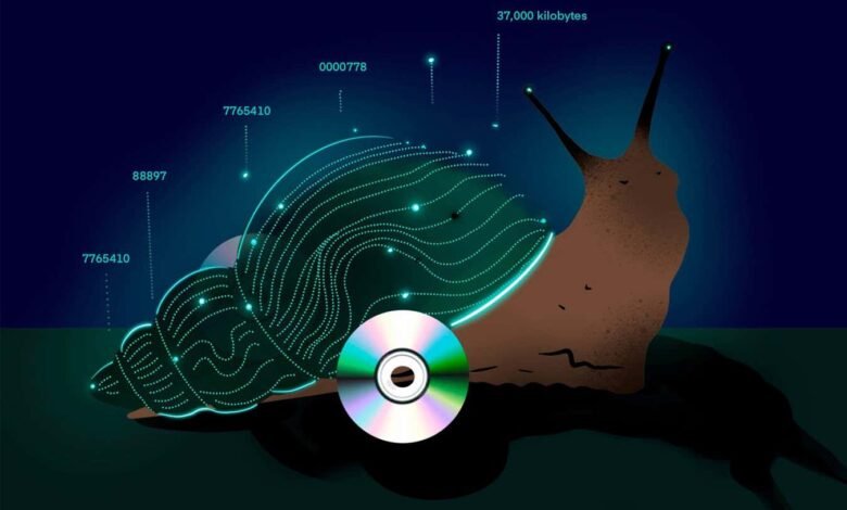 Fortunately, Bruce has a solution. He points us to a 2005 study in the parody scientific journal Annals of Improbable Research, which describes SNAP: SNAil-based data transfer Protocol. The researchers attached a giant African land snail to a two-wheeled cart, the wheels of which were CDs or DVDs. While the snail moved slowly, the data nonetheless travelled at 37,000 kilobytes per second – meaning the snail-based system transferred information quicker than existing broadband connections.